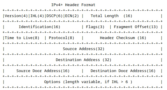 IPv4+ propone el uso de direcciones IP con números decimales, separados por puntos, pero añade algo llamado «door» o «puerta», esto último extiende el rango de direcciones de 32 bits a 48, solucionando de esta manera el agotamiento por parte de IPv4.