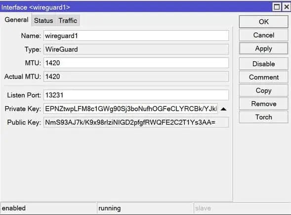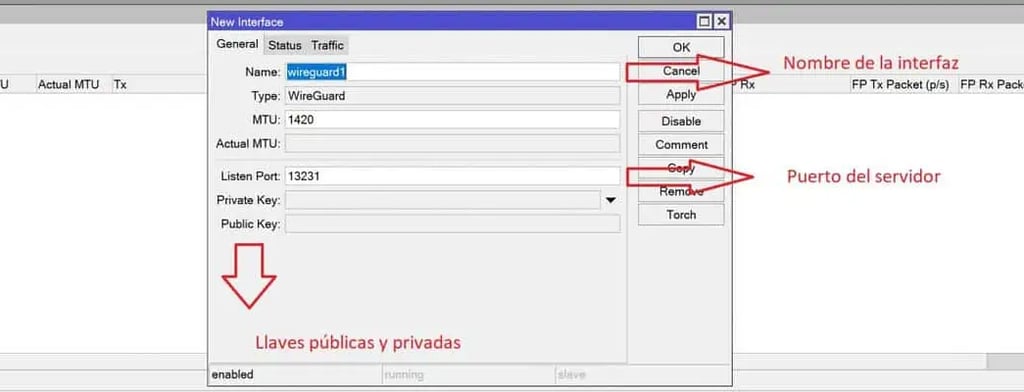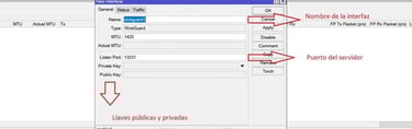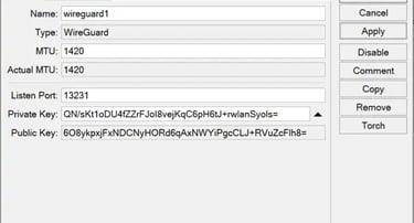 Realizaremos los mismos pasos que hemos hecho anteriormente cuando creamos el servidor. Ir a la opción WireGuard y hacer clic en + para crear el servidor, dejaremos los mismos puertos y haremos clic en «Apply» para que se generen las llaves como la imagen a continuación: