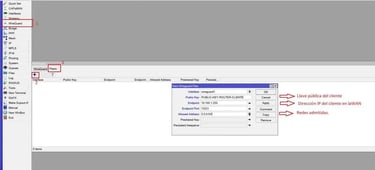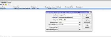 Para esta configuración de peers entonces, se necesitara completar la llave pública del servidor en el lado cliente y la llave publica cliente, en el lado servidor. Lo veremos en las siguientes imágenes.