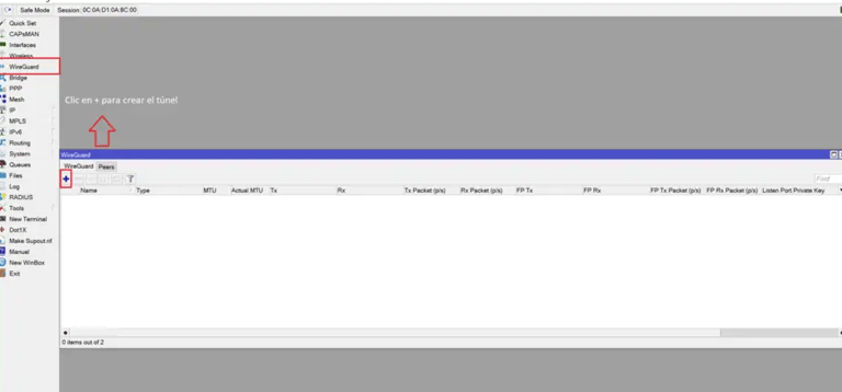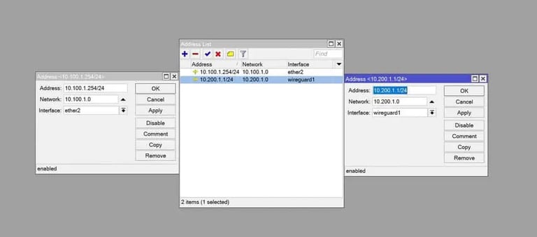 Hemos asignado dos direcciones IP para distintas interfaces, tomaremos que la interfaz Ether2 será nuestra WAN y luego la interfaz Wireguard1 es la interfaz que se configuró al crear el túnel, asignaremos direcciones IP a cada una de las interfaces de este laboratorio. En un entorno real, la interfaz WAN quizás tome una dirección IP desde un cliente DHCP.